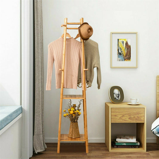 2 Tier Bamboo Hall Tree Coat Rack with Clothes Hanger and...