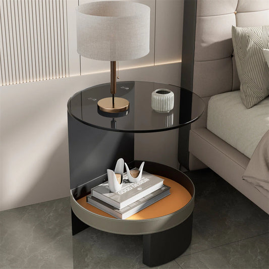 2-Tier Leather Side Table with Glass Top