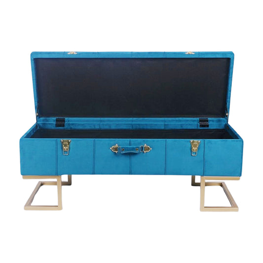 KD Storage Ottoman in Velvet Peacock Blue in gold iron base