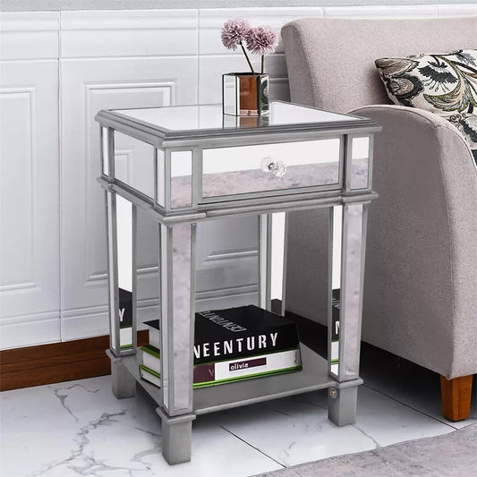 2-Tier Luxury Silver Mirrored Side Table Nightstand with ...