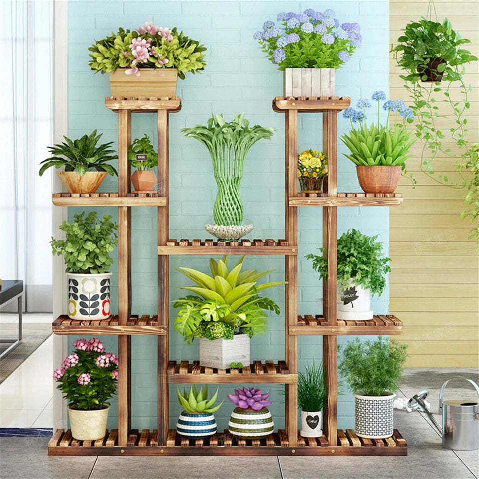 - STURDY PINE WOOD : This 9 tiered plant shelves made of high quality pine wood, carbonized at a high temperature to ensure the sturdiness and moistureproof ability; lightweight but strong enough to hold numerous plants of varying sizes