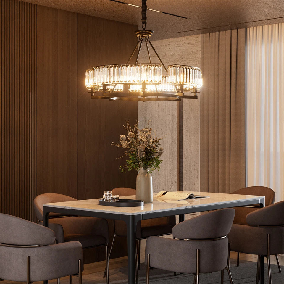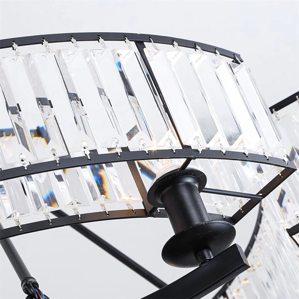 - Industrial-style chandelier with matte black circular frame and precision-cut elongated crystals for stunning reflections and elegant appeal.