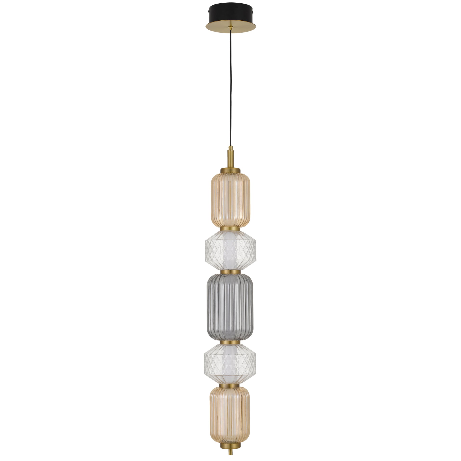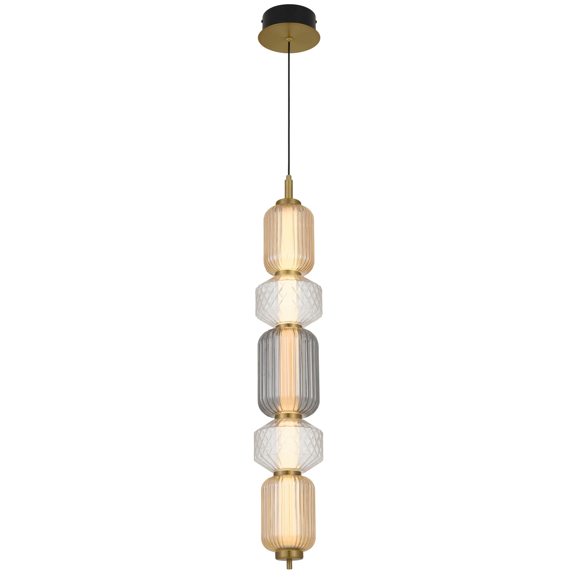 The TORSO PE5-BRS pendant features five 26W non-dimmable LEDs at 3000K, delivering 734 lumens of warm light. It measures 1000 mm in height with a 150 mm diameter shade, suspended by a 2-meter cable. The elegant brass finish is complemented by amber smoke clear glass shades, creating a sophisticated, modern aesthetic.