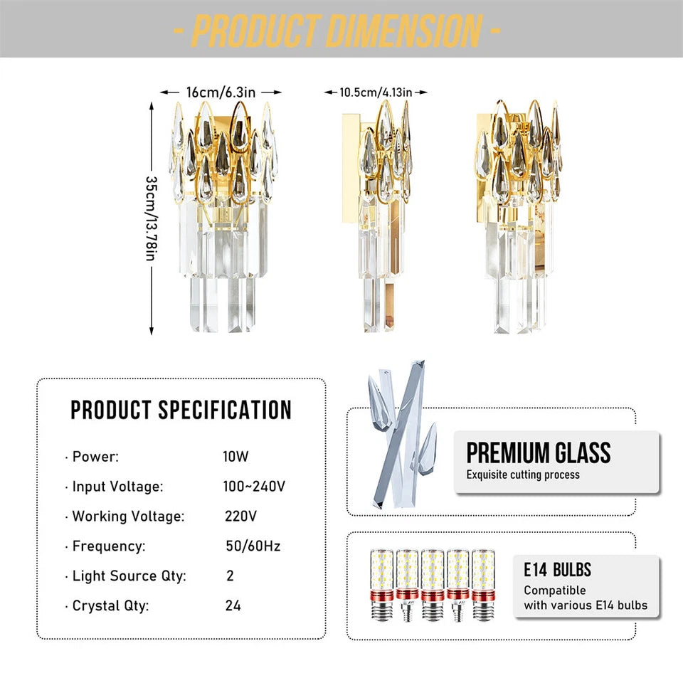 Package Includes: 1x Crystal Wall Sconce, 1x Instruction Guide, 1x Pair of Gloves