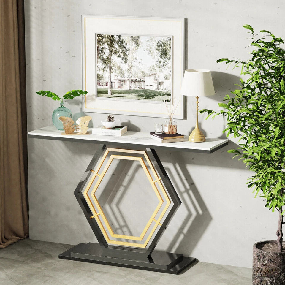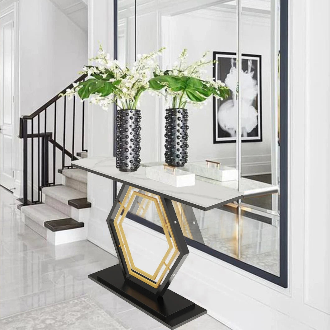 - Console table with geometric gold black base, which gives off a luxury style and appeals to be eye-catching at first sight. It’s a beautiful piece of furniture perfect for the foyer or entrance, and seamlessly pairs with other decorations.