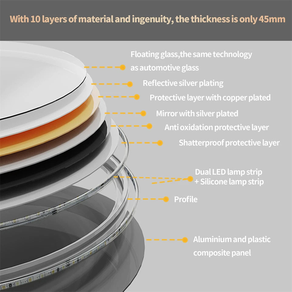 Led Backlit Light Front and back LED strips provide ambient light, perfect for makeup, grooming, shaving, face washing, and checking clothes. Energy efficient and prevents facial shadows.