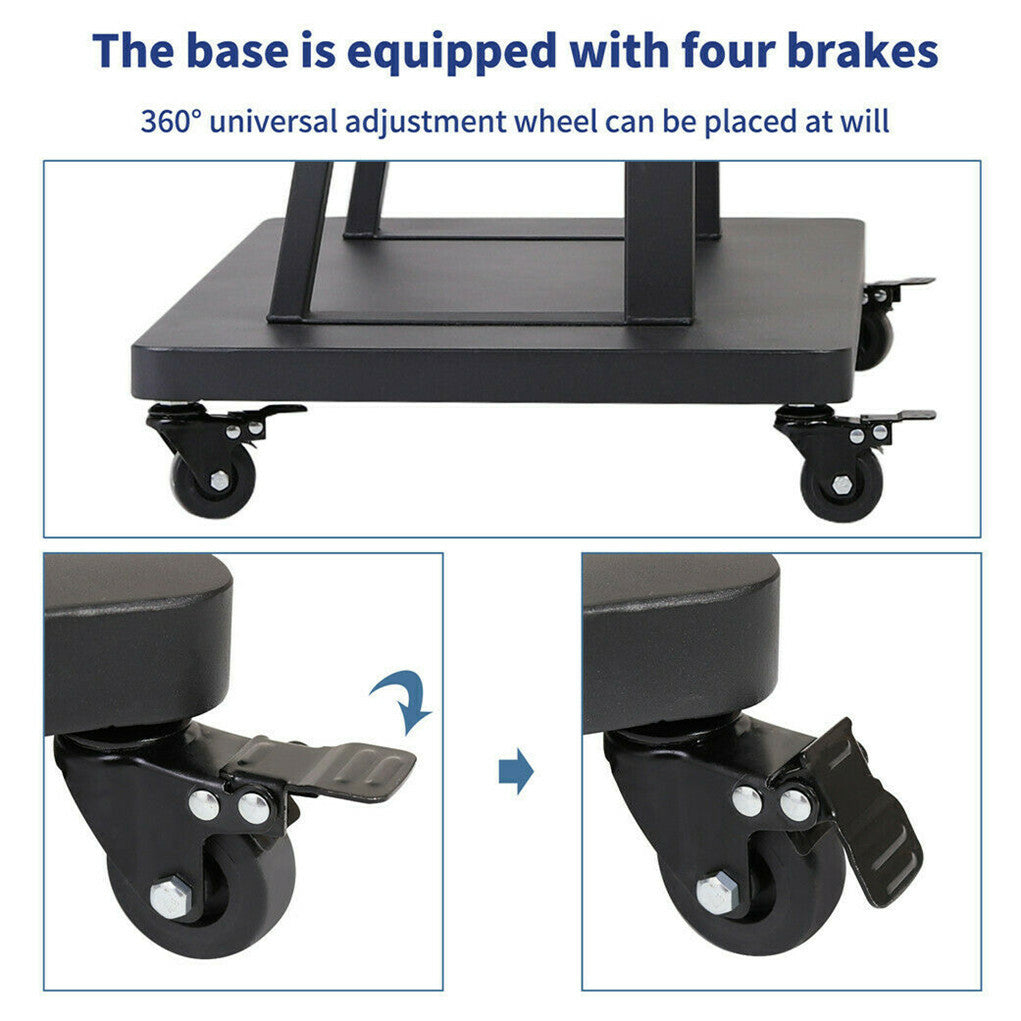 Lockable Casters TV mount is designed with four lockable universal wheels for easy maneuver and rotate it in any positions, allowing you to move it from one place to another without trouble. Equipped with reinforced safe screws for added stability and safety, prevents the TVs from falling down and being stolen.