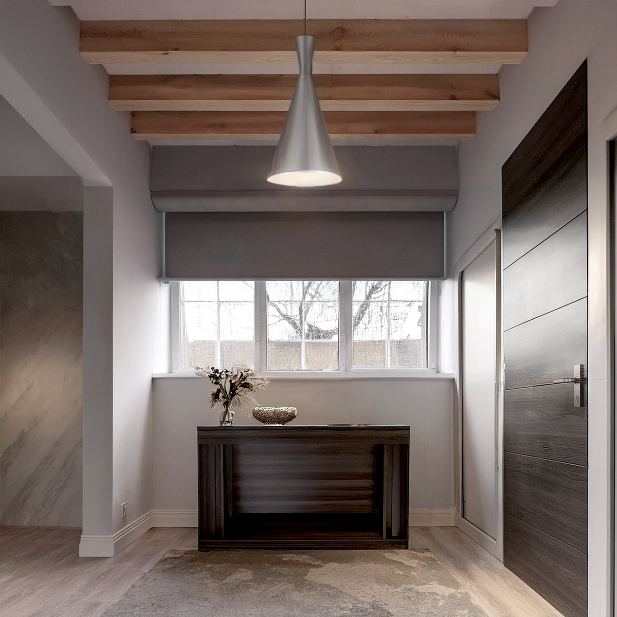The FLERO PE30-ALB pendant light blends industrial edge with modern sophistication, featuring a brushed aluminium exterior with bold black detailing. Ideal for enhancing dining rooms, kitchen islands, or office spaces, this fixture delivers a clean architectural statement while providing ambient light.