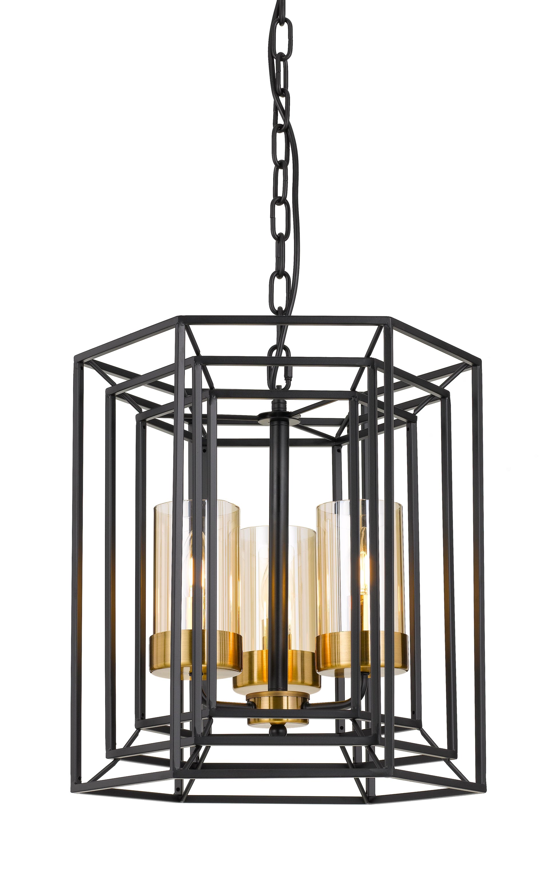 LANE PE3-BKAB Black, Antique Brass & Amber Glass 3-Light Pendant