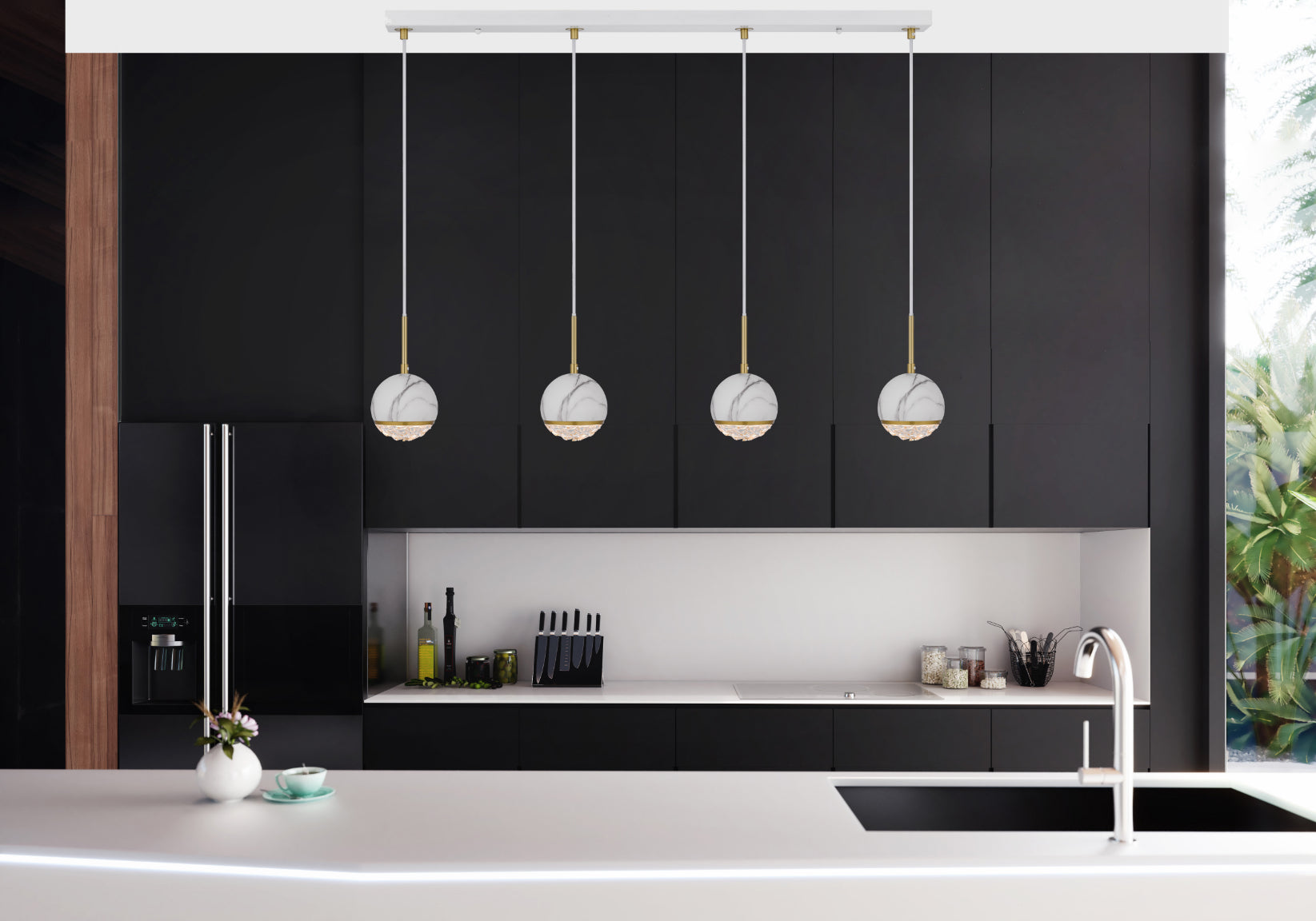 The ONETA PE04-WHCL pendant features a clean, modern aesthetic with a sophisticated white marble-look finish and four elegant clear glass shades. Designed for statement lighting over dining tables, kitchen islands, or open spaces, its linear form and 2m suspension cable offer both function and refined style. Perfect for interiors seeking a blend of elegance and minimalism.
