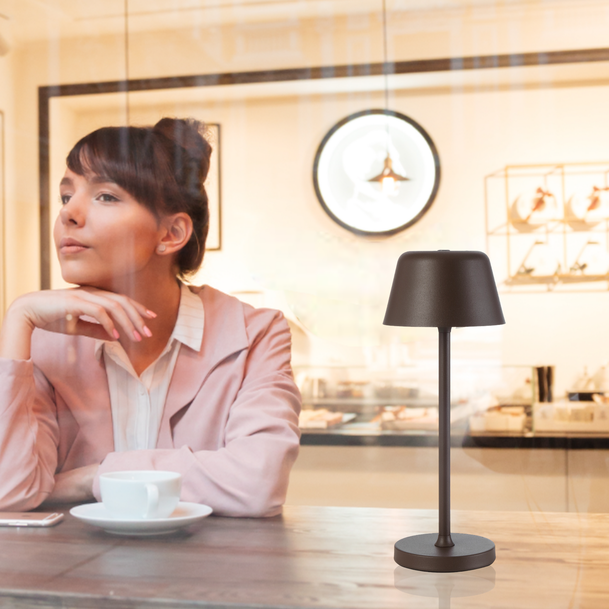 The BRIANA TL table lamp features a warm brown sand finish combined with rechargeable LED technology for cordless convenience. It includes a touch switch, IP54 water resistance, and three colour temperature settings (3CCT), providing 300 lumens of adjustable warm light. Ideal for desks, bedside tables, or accent lighting, this compact lamp blends modern design with practical functionality.
