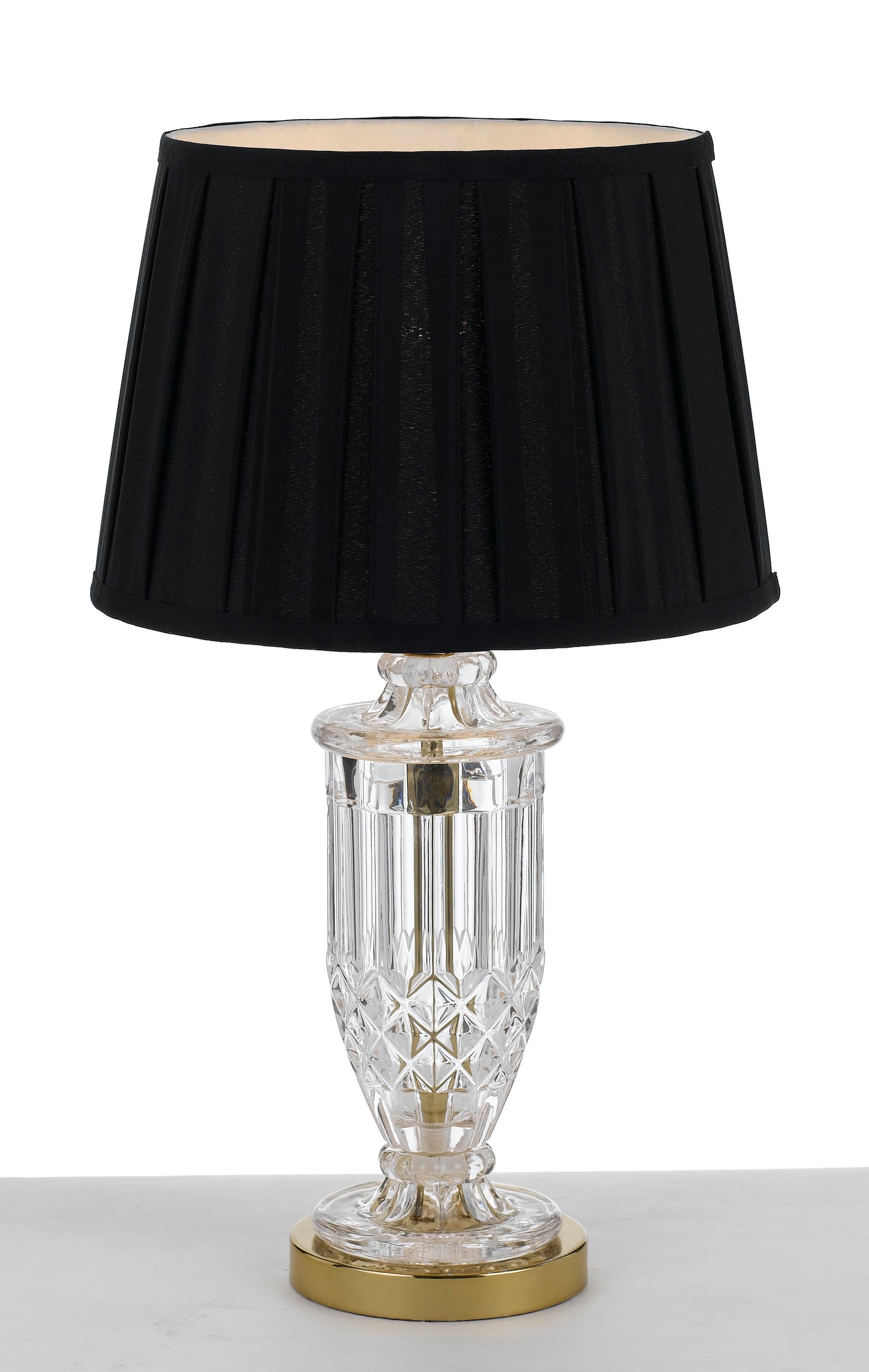 Add a luxurious touch to your decor with the ADRIA Table Lamp in Gold and Black. Featuring a striking gold base, clear glass accents, and a bold black fabric shade, the ADRIA TL-GDBK brings warmth and elegance to any modern interior.